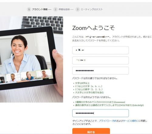 「名前」「姓」「パスワード」を入力して続けるボタンをクリックしてください。