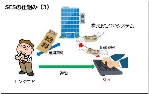 〇〇システムは、エンジニアに給料を支払いますので、SES会社は以下の図式で成り立っています。